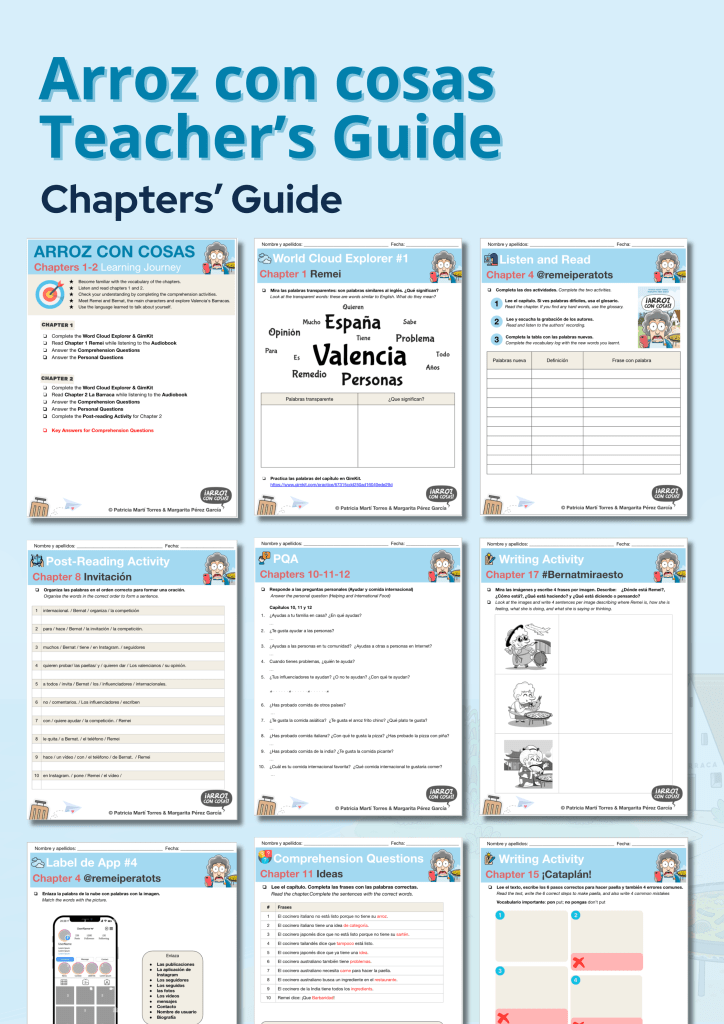 El libro de Arroz con cosas es una historia muy original y divertida, pero con tradición y cultura, y con un tema muy apropiado para la época: fotos, seguidores e influencers de Instagram! Remei nos presenta la figura de una abuela tradicional – pero joven-, con muchas ganas (¡y sin miedo!) de mostrarle al mundo lo que realmente es La Paella – es decir, la paella verdadera, ¡eh! Un libro con mucho jugo para abordar una variedad de temas (culturales y modernos) y con una narración sencilla pero muy rica en vocabulario. La guía para profes me sirvió muchísimo. Además, tiene ejercicios y juegos para reforzar el vocabulario y expandir el aprendizaje; ideal para acompañar el trabajo en clase y para tarea en casa.