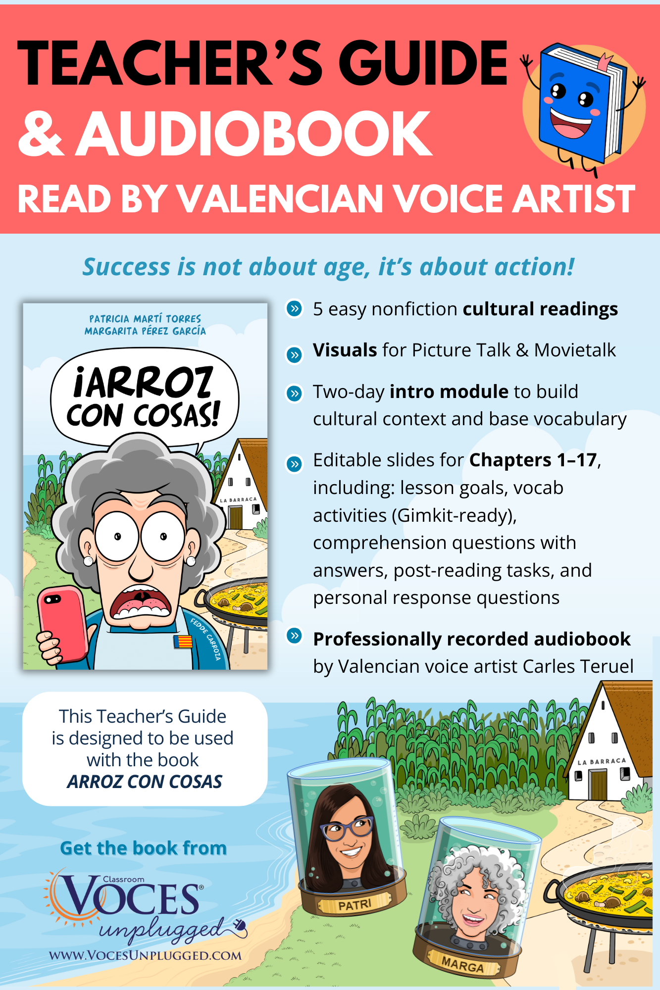 El libro de Arroz con cosas es una historia muy original y divertida, pero con tradición y cultura, y con un tema muy apropiado para la época: fotos, seguidores e influencers de Instagram! Remei nos presenta la figura de una abuela tradicional – pero joven-, con muchas ganas (¡y sin miedo!) de mostrarle al mundo lo que realmente es La Paella – es decir, la paella verdadera, ¡eh! Un libro con mucho jugo para abordar una variedad de temas (culturales y modernos) y con una narración sencilla pero muy rica en vocabulario. La guía para profes me sirvió muchísimo. Además, tiene ejercicios y juegos para reforzar el vocabulario y expandir el aprendizaje; ideal para acompañar el trabajo en clase y para tarea en casa.