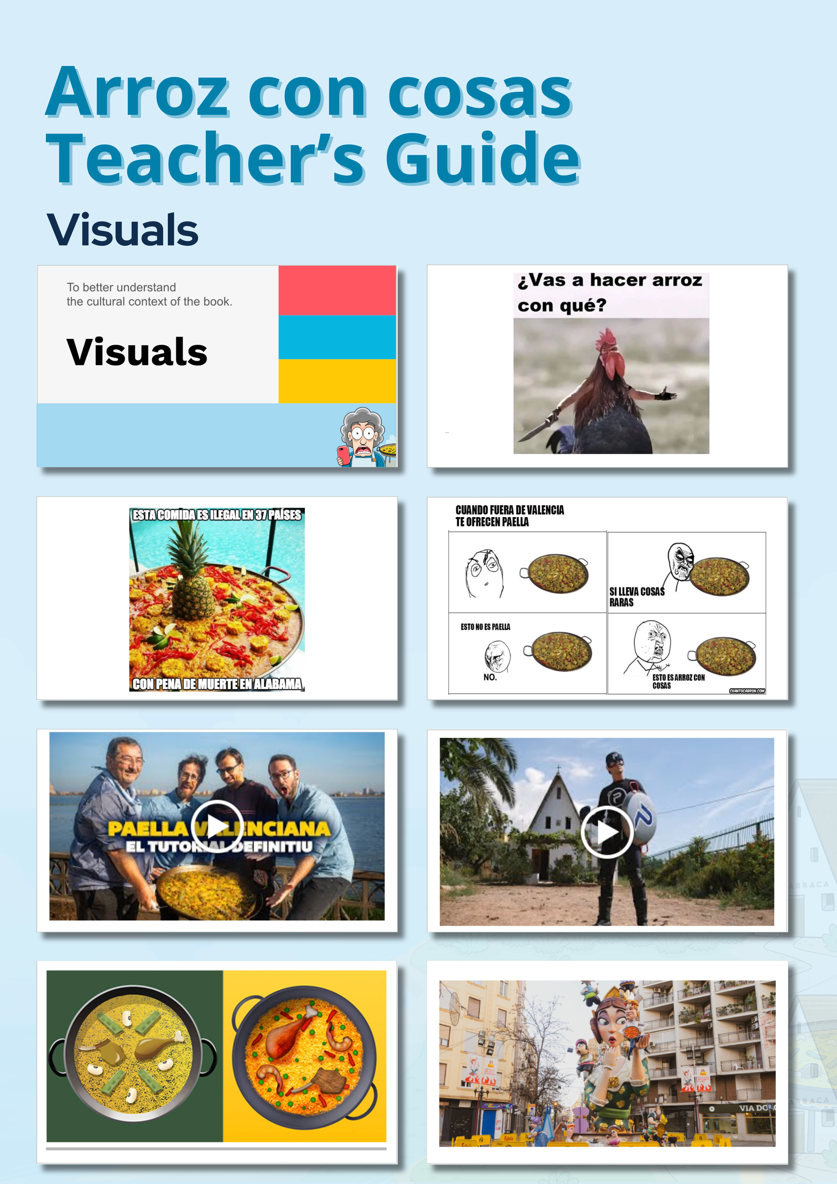 Visuals for PictureTalk & MovieTalk on memes about arroz, “What is paella?”, “What is arroz con cosas?”, paella songs and adverts, photos of arroz con cosas, Fallas celebrations involving paellas, controversial paellas, and official paella emojis.